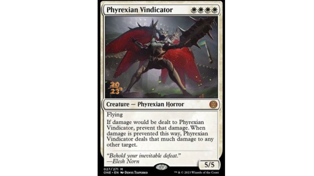 The promo version of Phyrexian Vindicator is a card that holds a decent value. This is likely because it’s big, tough, and can avoid a lot of damage from your opponent. It’s also got a nasty trick up its sleeve that will damage your opponent if they try to be sneaky.
