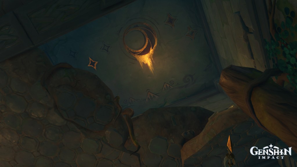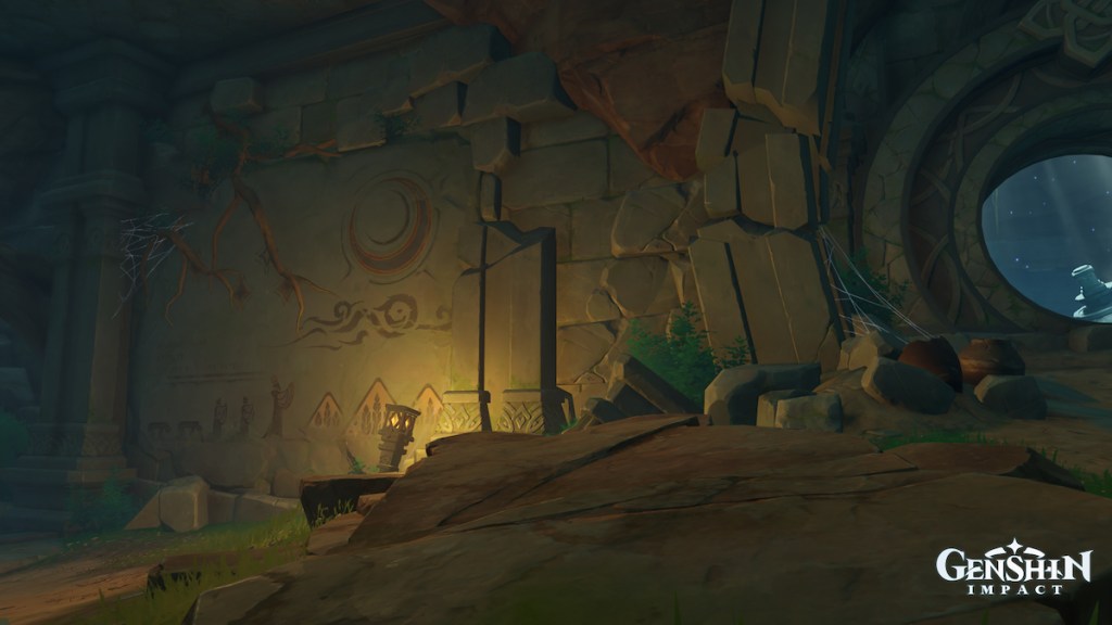 To reach the second Ruin Mural, head back up the stairs and proceed left to reach a round doorway, which you will enter. All other ruin murals are located in rooms that branch off from this large chamber. You can easily reach these locations by following the path clockwise around the ruined dome located in the center of the large room. You’ll reach a grassy area with trees and the entrance to a new room, in which you’ll find the second mural located on the wall to your left.