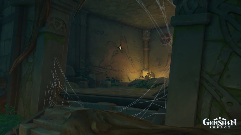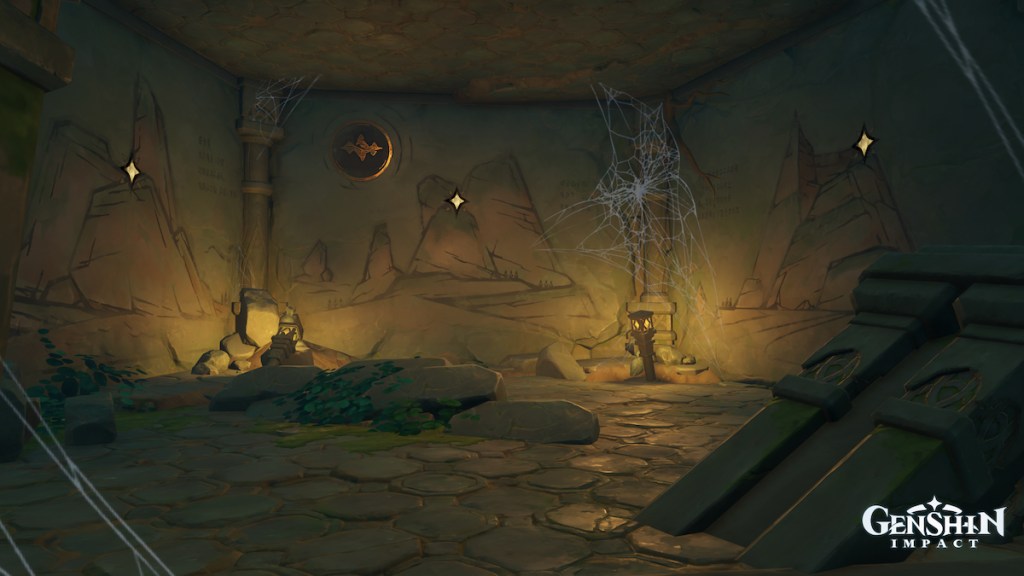 The last three Ruin Murals you’ll need to photograph are all located in the same room. To reach them, head back into the main chamber and continue down the path just a little further until you reach a short staircase with lanterns on either side. At the top of these stairs, you’ll enter a large chamber featuring murals on all three walls. The fourth mural is the one straight ahead, the fifth is to your left, and the sixth and final mural is on your right.