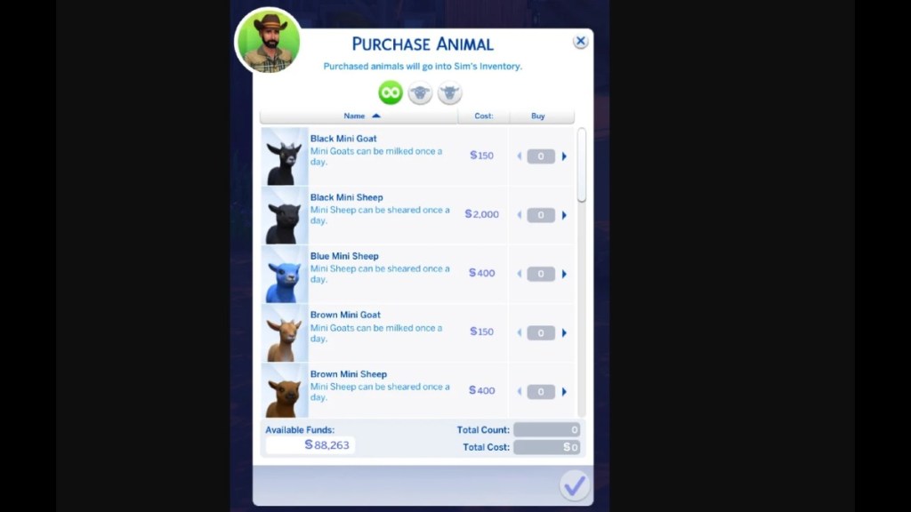 Thankfully, buying a mini goat or sheep is relatively straightforward once you’re on the Purchase Animals menu. Here, you can browse through the available baby animals to pick the ones you want. There are several different colors to choose from, and they vary in price depending on which color you pick. A blue goat, for instance, will run you 400 Simoleons while a more standard brown one is only 150.