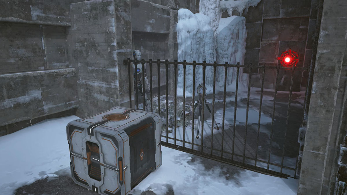 With this new body, drop down to the main level where the Energy Gate has been disabled and pick up the Hexahedron. Take it out to the main area and head to the back far right side, where you’ll see a Connector and a Red Transmitter behind some bars. Place the Hexahedron down up against the bars, jump on the Hexahedron, then pick up the Connector. If you’re having issues picking up the Connector, I recommend jumping over the bars and then moving the Connector closer to the Hexahedron. There is a ladder in here which you can use to get back to the main area.