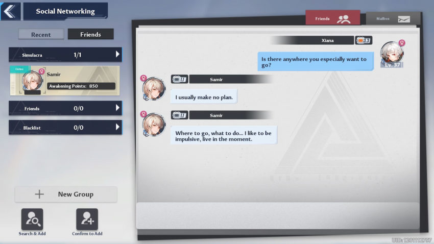 Giving gifts to your Simulacra will eventually unlock logs — text chats with the character you can complete at your leisure. These will sometimes update at the daily reset, so if you’ve progressed your Simulacra Awakening enough, check the Friends menu to see if there are any new messages.