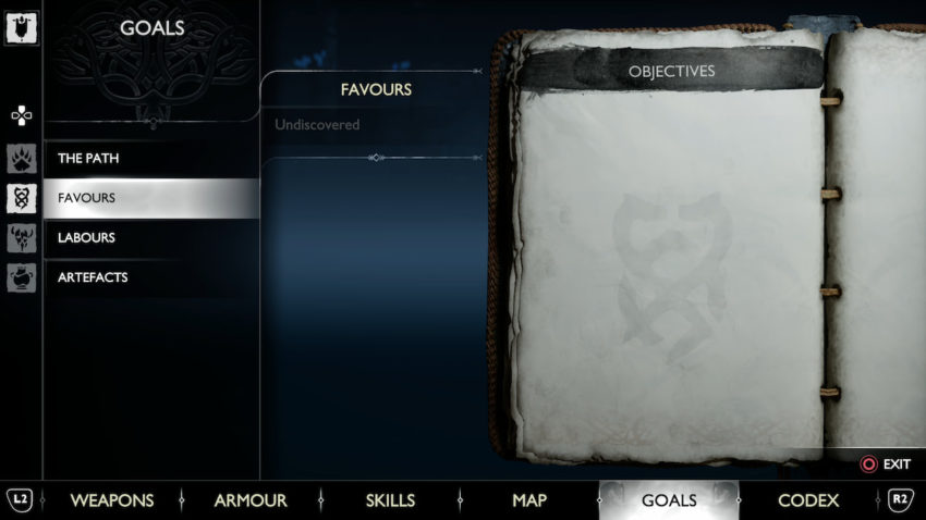 Favours consist of minor and significant sidequests Kratos and Atreus will find in Ragnarök. These sidequests usually involve several steps and often grant you a powerful reward and experience when completed. You can access this menu option to track these special quests while exploring the various realms. Each Favour will often award you with a new piece of armor, weapon attachment, or Runic ability upon completion.