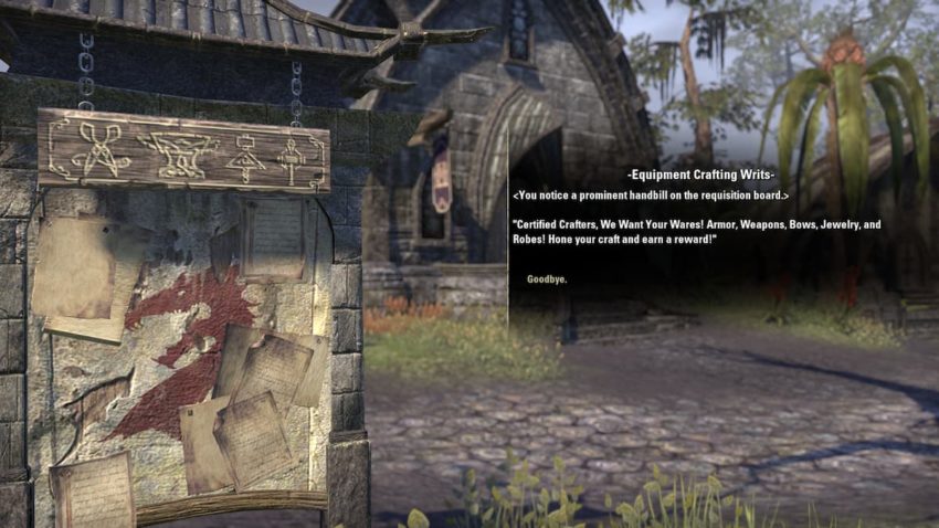 Once certified, you now have access to the Writs system. Once a day, resetting at 0600 GMT, you can grab a series of quests from two separate Writ boards — Equipment and Consumable. Equipment Writs involve Clothier, Woodworking, and Blacksmithing, while Consumables include Enchanting, Alchemy, and Provisioning.