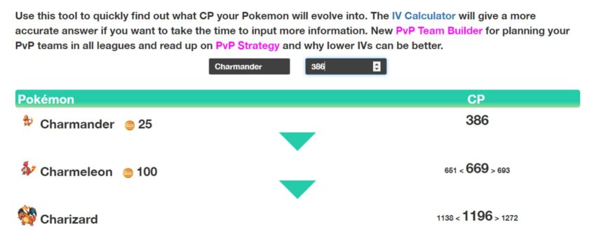 When you enter the species and current combat power of your Pokémon, the calculator will let you know an approximation of what it will look like after evolution. This is best used for two situations. The first is when you have multiple of the same Pokémon eligible to be evolved. You can look at where they could possibly stand afterwards and put your resources there. The second is when you have an unevolved Pokémon that you think might have more potential than one you already evolved. You can see how they would look if you went forward putting your candies into them instead of the latter one.