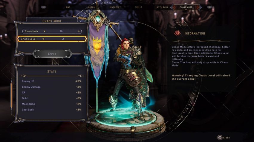 After you learn about the Chaos Chamber, go into your menu and the farthest tab on the right will now be Chaos Mode. This game mode works like the Mayhem Mode of Borderlands 3. There are multiple levels of Chaos that you can have active. When you go into the menu, you will see the option to turn Chaos Mode on and off as well as the option to change the current Chaos Level. Chaos mode makes things harder by increasing enemy health and damage. In return, you get a boost to your Loot Luck, XP, Gold, and Moon Orbs. Since Chaos Mode is linked to the Chaos Chamber, the current level of Chaos you can have active is dependent on your current level in the Chaos Chamber. The higher the level, the more deadly the enemies become and the better the loot you receive will be.