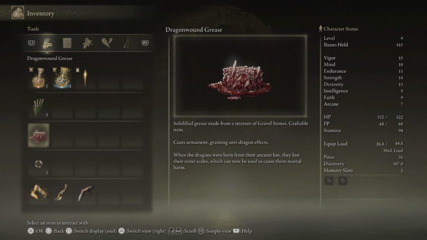 If dragons are giving you trouble, why not try some Dragonwound Grease? This handy item is something you should keep on your person at all times for when a dragon happens to come by. The item description states that it “coats an armament, granting anti-dragon effects. Here’s what you do with Dragonwound Grease in Elden Ring.