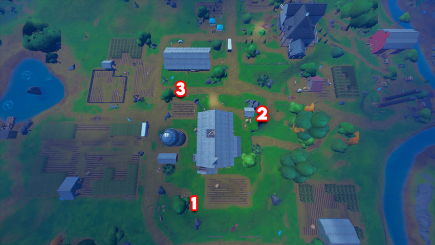 There are three different places that you can leave pallets of cat food, all marked on the image below. You only need to play two, and all of them are clustered around the large red barn that sits on top of the secret IO base and acts as an entrance.