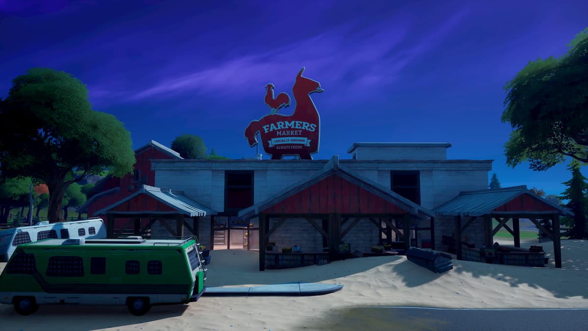 You can find the Orchard Farmers Market right on the northeastern corner of the desert, just above Colossal Coliseum. It is not a bad spot to start your game, as there is plenty of loot to be had here if you want to drop straight in from the Battle Bus and finish up the challenge at the start of the match.