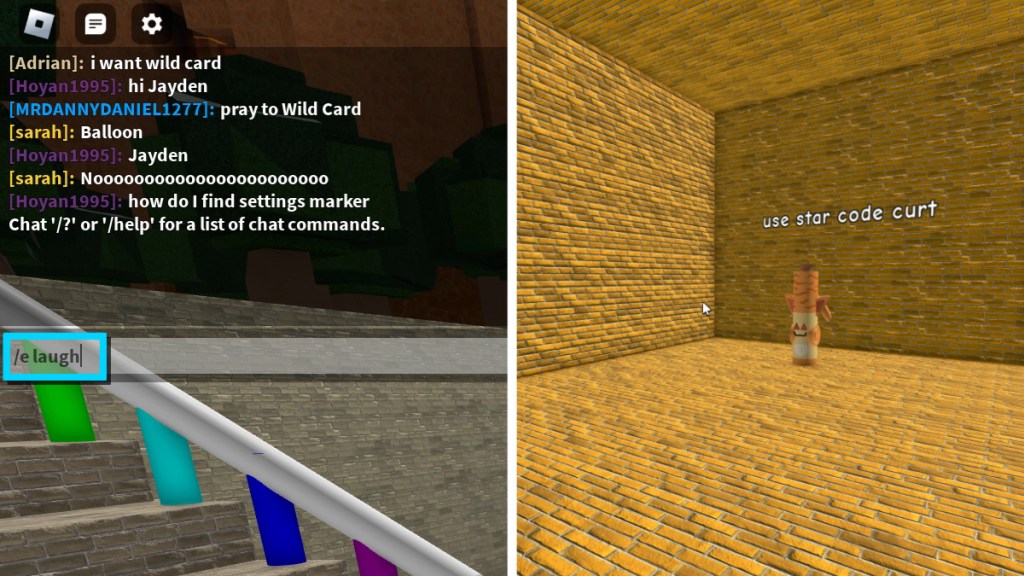 As noted above, finding the Catzo Marker in Roblox Find the Markers only requires a single step. After arriving at Spawn, interact with your server’s chat and type in the phrase “/e laugh.” Make sure that there is a space after “e” and that the forward slash comes before the “e.” Once you hit enter, you will be instantly teleported to a yellow-colored brick room the size of a small house in Roblox. At the back of the secret room sits the Catzo Marker in Find the Markers, with the text “use star code curt” on the wall behind it.