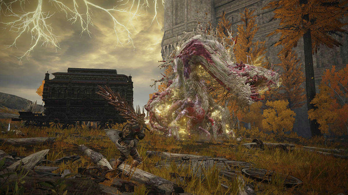 From Seed 7, move southwest along the road on the outskirts of Leyndell to the next roundabout — the tree in the middle is difficult to miss. A twin-blade gargoyle will drop halfway between the two points of Seed 7 and Seed 8. The fight can be frustrating due to elevation differences, but don’t bring the fight off the road: a slew of minor enemies to the east can muddle the fight.