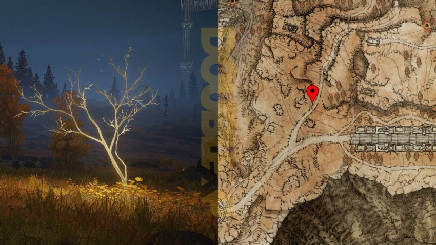 From Seed 4, move north-northeast along the path, taking you deep into lush woods and scarlet flowers. This tree is just a bit north west of the Minor Erdtree to the south, guarded by the Wormface boss.