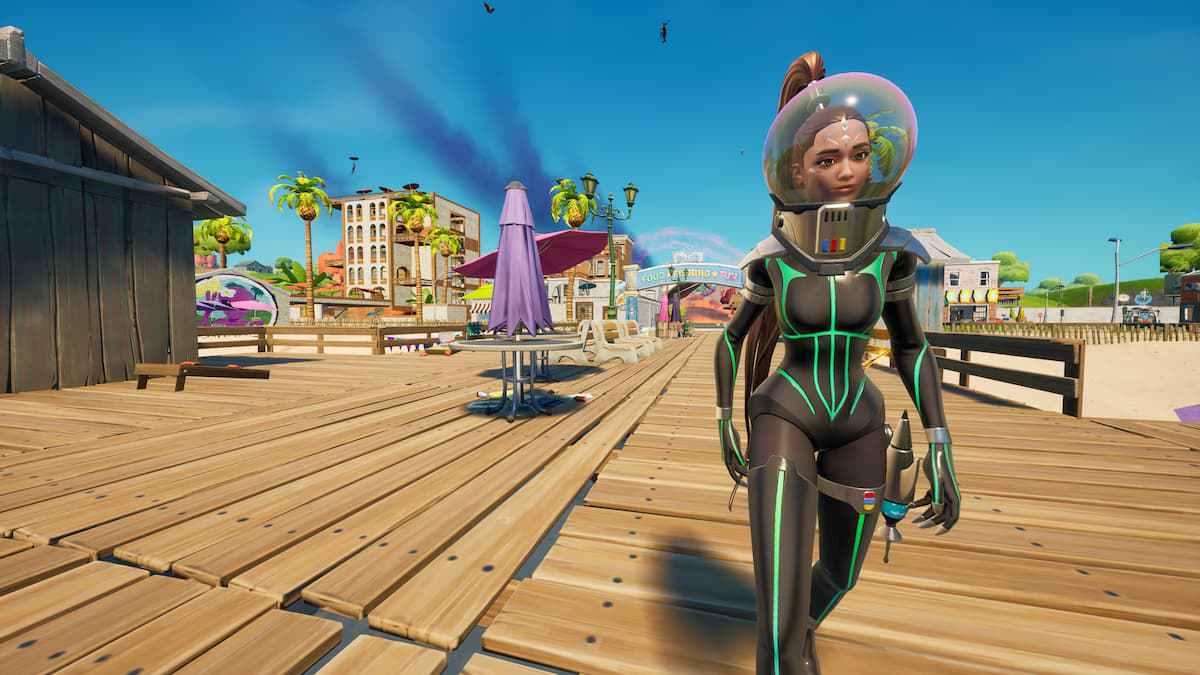 Firstly, you’ll need to figure out her location before any of these challenges can be carried out. During Chapter 2 Season 8, players can find Ariana walking down the long pier on Believer Beach in a glowing space outfit and a text-box above her head. The pier isn’t hard to miss as it stretches far into the southern waters of Coral Castle (as shown below).