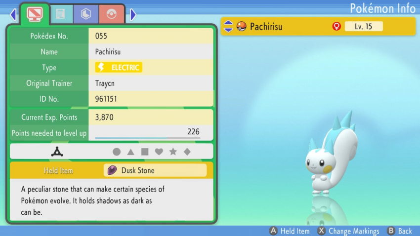 You’ll be able to acquire the Dusk Stone by catching a Pokémon that has the Pickup ability. The Pickup ability is a unique ability that, while you’re out exploring, your Pokémon will randomly grab items as it’s progressing through the game. For us, we were able to capture a Pachirisu that had this ability, and while we were exploring the game, it grabbed it for us.