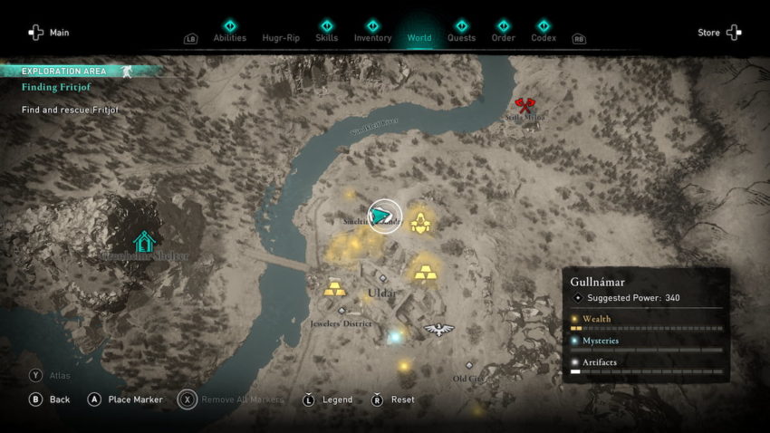 Unfortunately, you won’t know you’re about to find an Uncut Gemstone until you approach a location, so you’re going to spend quite a bit of time on your mount trying to find them. When you do approach locations with an Uncut Gemstone, you’ll see a small rock icon on your compass, and you’ll be able to use Odin’s Sight to narrow down its exact location. When you have enough, return to the Dwarf in Grenhellir Shelter and present it to him.