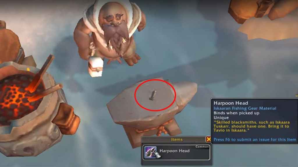 Look for the Tuskarr NPC Arvik pounding away with a hammer, and you should see a Harpoon Head sitting on the anvil. Simply loot it and you have the first piece you need to create an Iskaaran Harpoon. Combine this with a Wooden Pole and Tattered Seavine to finish the job.