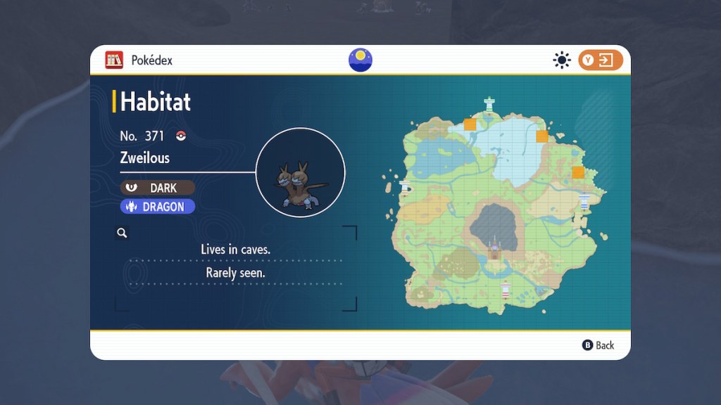 Zweilous is the second Pokémon in the evolutionary line and is a far tougher find than Deino, given it’s found in fewer areas and is a rare spawn. If you try to find one or happen upon these areas, you may get lucky and see one in the Northwest and Northeast Corners of Glaseado Mountain, North Province (Area Two), and in Area Zero, which you can access after beating the game.