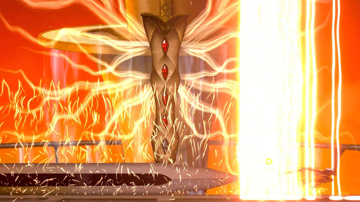 Your first objective marker will eventually lead you to the top of the Light Tower. It’s a long climb, as you bounce past damaging radiant beams and escape from a massive sword that pelts you with bursts of magic spells. When you finally reach the top of the tower, you’ll have to face that giant sword in a boss encounter.