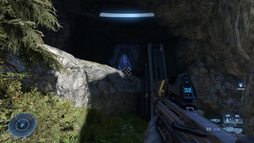 Continue trudging along past the facility. Following this path behind the building leads you to a blue forerunner door. Go through it to find an enclosed room with a Halo Infinite arcade machine.