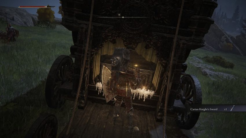 To get the Carian Knight’s Sword, you’ll have to raid the caravan that travels along the road to the south of the Northern Liurnia Lake Shore Site of Grace, marked on the above map. This caravan travels north along the road, meaning it should cross your path before long. To access the chest, you’ll first have to stop it by defeating (or at least distracting) one of the trolls pulling it. This is easier if you can take out the guards trailing it one or two at a time.