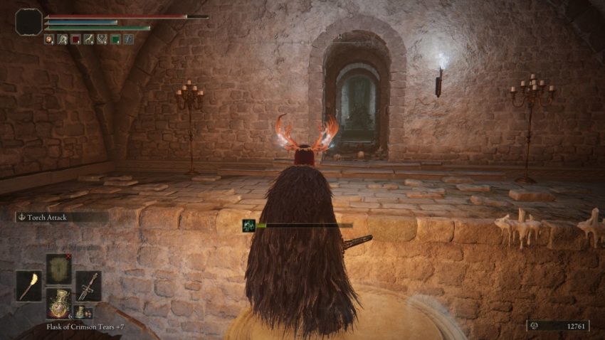 Once you get into the catacombs, go down the stairs to find the Site of Grace. Go through the dungeon until you find one of the imp statues that shoots fire. Run down the tunnel, avoiding the fire as you go. Hit the imp statue to make it lower. Hit it again and quickly jump onto it to get raised up to the upper floor. You will see a small doorway with a large enemy on the other side. The talisman is sitting in front of the enemy. You can easily take them out by using ranged attacks since the enemy can’t go through the doorway.