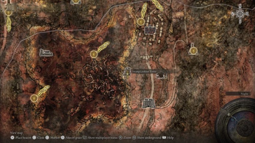 Once you reach the Caelid, travel east to the town of Sellia. You will need to get to the mountains above Sellia. This can be done in two ways. You can either go around the cliffs to the west or through Sellia if you have the gates unlocked. Travel up the hills and go to the Sellia Gateway. This is the large gate that is south of Sellia. Instead of going through the gate, you will need to go through the upper level of the gateway to get to the other hill across from you. After going through the gateway, head north to find the Swamp Overlook Tower. The sorcery can be found inside guarded by a Bloodhound Knight. Be careful, the Bloodhound Knight can inflict a lot of bleed damage.