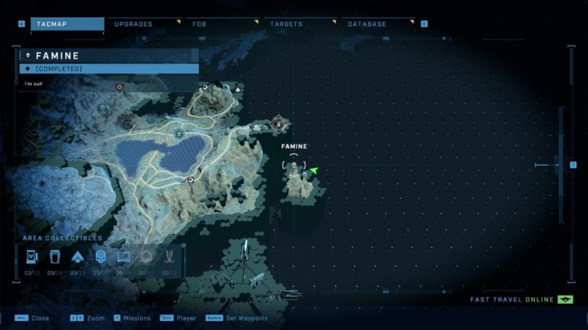 You won’t be able to obtain the Famine skull until you have completed the Pelican Down mission and started The Sequence mission. Once that has been accomplished, make your way to the southeast section of the map. If you are starting from the start of The Sequence mission you should already be there. Off the eastern side of the map is a small island. Use the map above for reference if needed.
