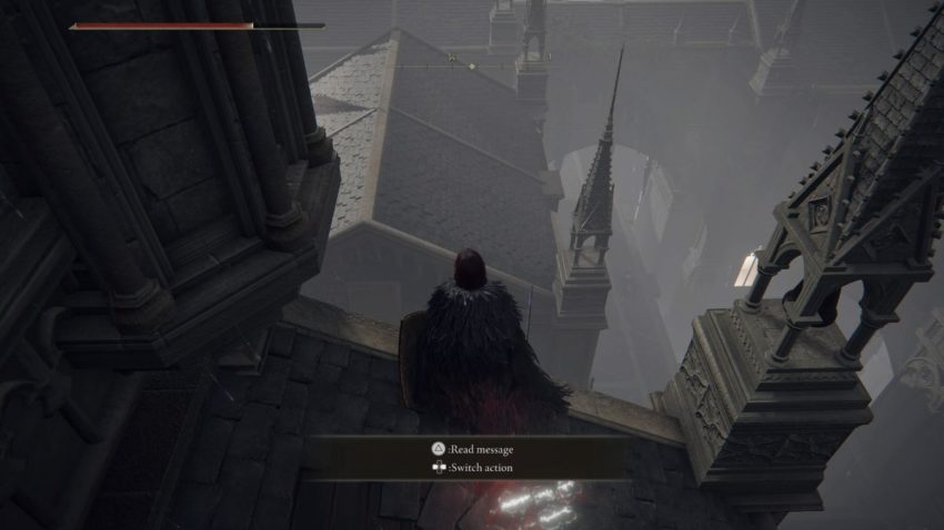 Continue along the path and past the magic enemy on the walkway above. Go onto the next set of rooftops and drop down. Look to your left and find the area to jump onto another rooftop. The jump doesn’t look possible but it is. After the jump, go left and drop down a few more roofs until you land next to a door. Go through the door to find a ladder. Climb to the top of the ladder. Open the chest at the top of the ladder to obtain the crossbow.