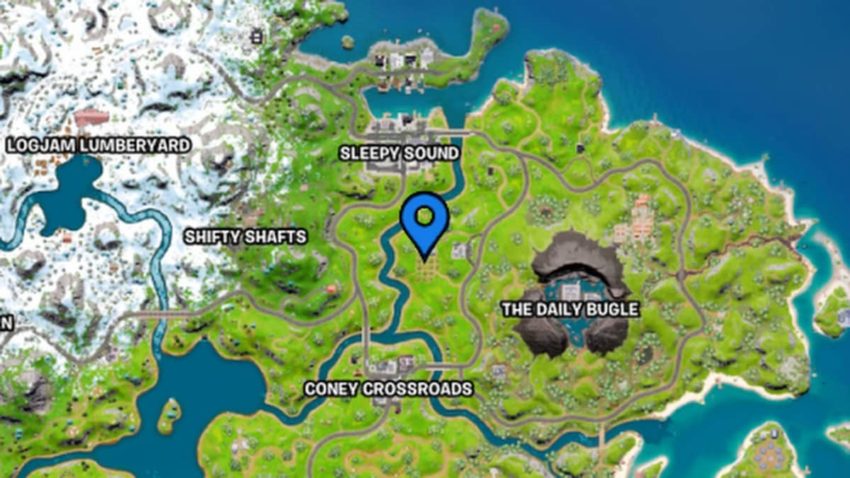 Sunflower’s Saplings is a landmark between Shifty Shafts and The Daily Bugle; though, you can find it on the right side of the river. As shown below, the location includes a massive garden and a few sheds full of chests. You can avoid these buildings and go straight to the garden to find the Level Up token in the center of the bushes near a red tractor.