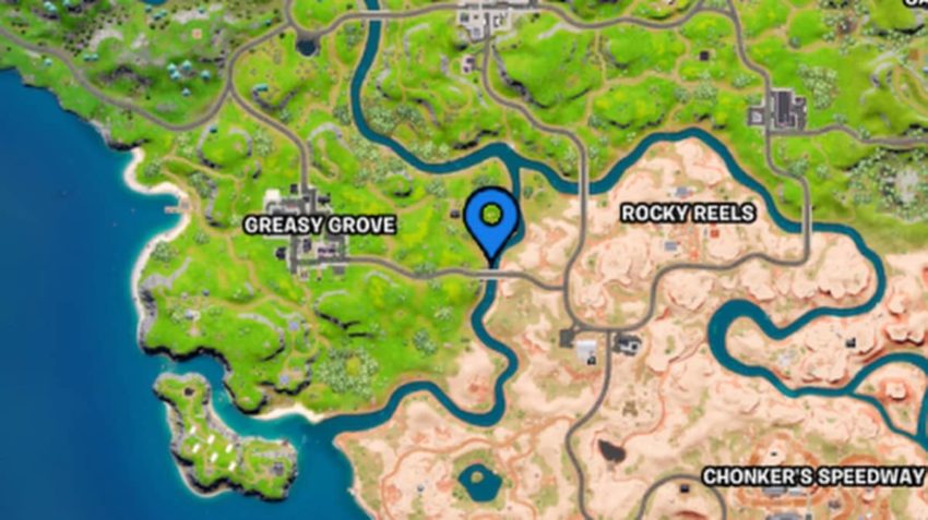 In the southwest side of the map, you can spot a river that runs between Greasy Grove and Rocky Reels. As one of the easiest tokens you’ll find during Week 1, head to the bridge that goes right over the water to discover the Level Up Token sitting in the middle of it.
