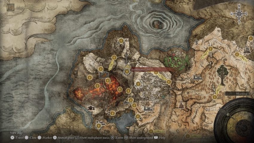 To obtain this armor set, you first need to make your way to Mt. Gelmir. This can be done in two ways. You can either gather the two halves of the Dectus Medallion and take the Grand Lift of Dectus up to Altus Plateau, or you can traverse the dungeons that connect Liurnia and Altus Plateau to one another. Once you reach Altus Plateau, travel west to the river section of Mt. Gelmir. From there, head north and you will discover a cave that is blocked by a fog wall. Use some of your Stonesword Keys on the nearby imp statue to open up the cave. This is Seethewater Cave.