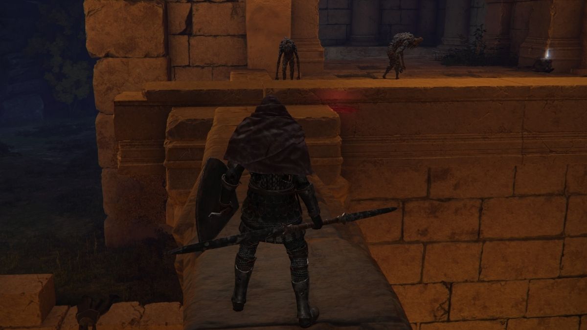 When you reach the bottom of the elevator, make your way through the ruins in front of you. You don’t need to kill all the enemies. They are slow and won’t be able to give chase if you are using your steed. Make it to the end of the ruins and turn around. Go up the hill to the area above the enemies you passed.
