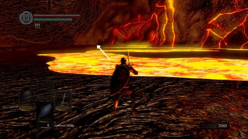 Once you reach the area with the lava pools, follow the path to there the ground starts going uphill. Turn around and go to the far end of the lava pools as shown in the image above. While going back there, a massive worm enemy will spawn that you will want to defeat. If left alone, it is possible for it to throw you off the cliff. Behind the giant worm is where you will find the Tachi katana.