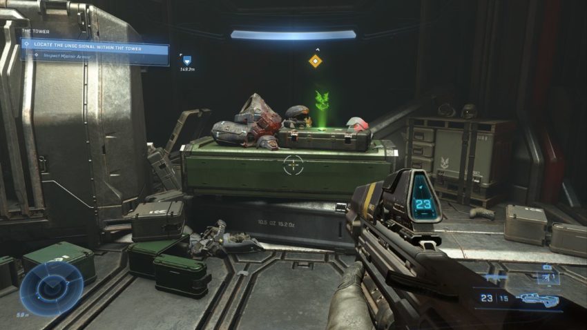 Once you reach The Tower, you will need to use your grappling hook to scale over the walls. There are plenty of enemies to fight inside so be prepared. Once you stop the lockdown, you will be tasked with opening the gravity lift to get inside the upper area. Activate the gravity lift and at the top, you will find a dead spartan that has the Threat Sensor upgrade.