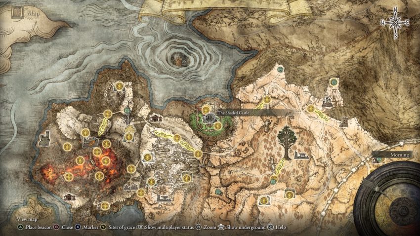 From the Erdtree Gazing Hill, you want to head straight north, to the green swamp on the map. Here, you will find the Shaded Castle and the Valkyrie’s Prosthesis. As you might have guessed from the green sludge on the map, the castle is located in the middle of a poison swamp. It is also filled with enemies that will inflict you with Scarlet Rot, so come prepared with remedies for both of those. There is a Site of Grace in the southeast corner; once you enter the castle grounds, you will want to hit.