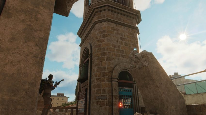 Once you’ve taken them out, climb up to the scaffolding using a red ladder on the right-hand side, and sneak to the back right of the cathedral. This is where you can find a clock tower. Using the keys you just grabbed, open the locked metal door. Inside, you’ll find the Zona-51 assault rifle.