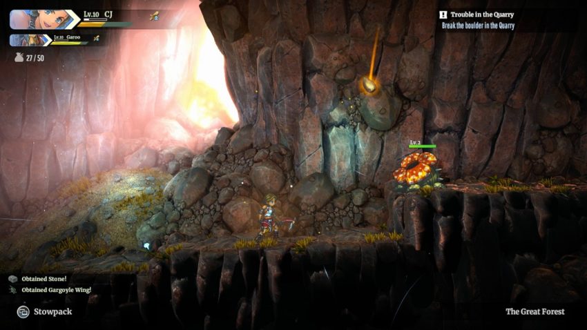 Titan Nectar is spotted within two sections of this level, and you can get this resource by defeating bulbous plants that spit out golden seeds in the air. The first is at the end of the cave section and is right of the Forest Cave signpost. The second is within the next forested section, uphill. While you’re there, you may want to pick up the items off the ground; you may obtain a beneficial resource called Wild Bird Eggs.