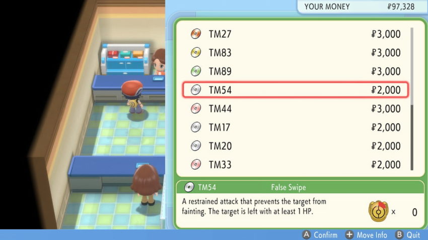 Once you’re inside the store, you’ll need to make your way up to the third floor of the building. There, speak with the woman on the top right portion of the store. She sells a variety of TMs that you can use on your Pokémon. False swipes will be one of these options. You can purchase the TM multiple times for 2,000. Then, you place it on various Pokémon, especially if you’re trying to catch several wild Pokémon with a team.