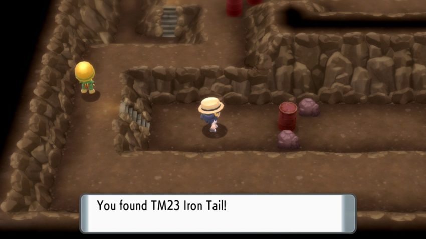 Next, take the downwards path and go up the narrow steps. Follow down the path and then on the right of the patrolling worker, you’ll see TM23 Iron Tail waiting to be picked up.
