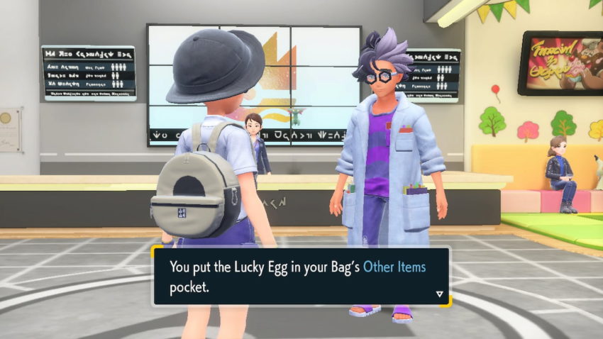 When you’ve defeated your fifth Gym Leader, travel to any remaining Gym Leaders and enter their Gym building. You will be greeted by Jacq, one of the teachers at your academy. Jacq will welcome you and then offer a gift to assist you in your endeavors moving forward: a lucky egg. You can now give it to any Pokémon you have in your party, and they will begin to earn more experience as they level up during your adventures.