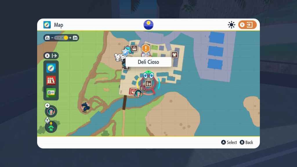 Finding Chorizo in Pokémon Scarlet and Violet is a relatively simple process. To do this, you’ll need to head to a Deli Cioso location. Conveniently, there are quite a few of these stalls scattered around Paldea. You can find them in many different cities, including Levincia, Cascarrafa, and even three of them in the largest city in the game: Mesagoza. To locate one, you can just look for the icons shown on the map above, which mark a variety of different shops. Then, center on them to identify which one is a Deli Cioso location.