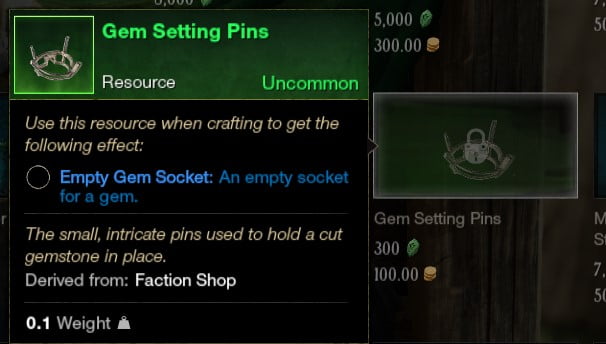 You’ll be able to purchase a Gem Setting Pin from any of the faction recruiters for your faction. You can visit them in any of the major settlements. When speaking with them, you’ll need to choose the option to buy the rewards from them. However, the choice is limited to the third rank of your faction, which you can only access when you reach level 35.
