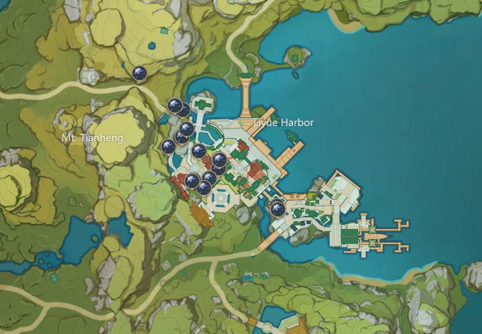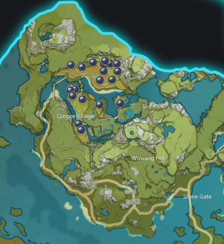 The flower is found loosely around the Liyue Harbor in small spread-out clusters of a few flowers. Most of them are at Yujing Terrace, but there’s also a group near the Waypoint of Chichu Rock, and another one on Mt. Tianheng. The best way to go about this route is to start from the southeast and make your way diagonally to the northwest.