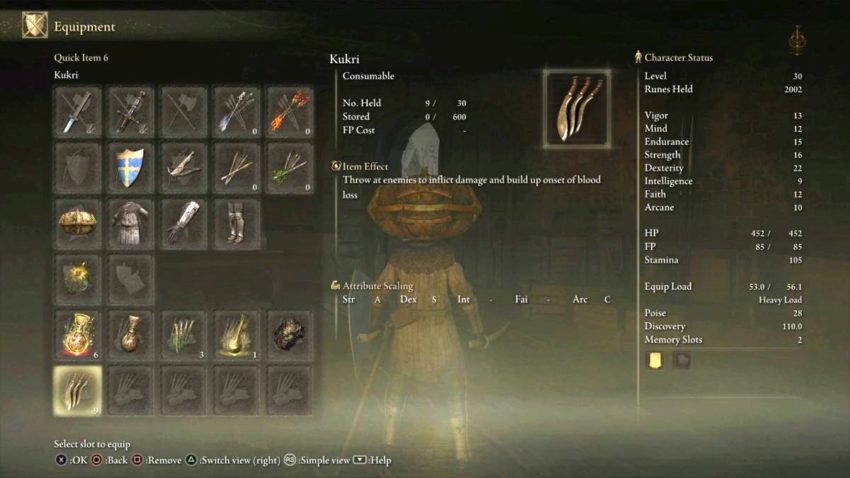 To use Kukri, go to your equipment, then down to your quick items. Select a quick item slot, then select Kukri. Return to the game and tap down on the D-pad to switch between your different quick item slots until you see Kukri. Now find an enemy and lock on, then press Square/X to throw a Kukri at the target.