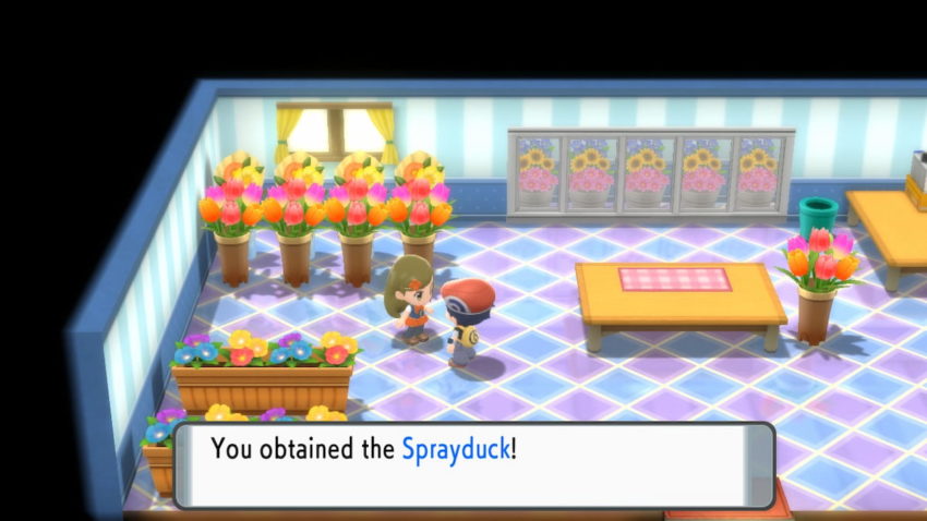You’ll be able to find it once you can reach Floaroma Town. When you arrive at the city, you’ll find a large building to the north part of the map with two berry bushes on either side of it. Enter the building, and speak to the woman on the left side of the room. She’ll immediately give your Sprayduck key item without having to do anything for her.