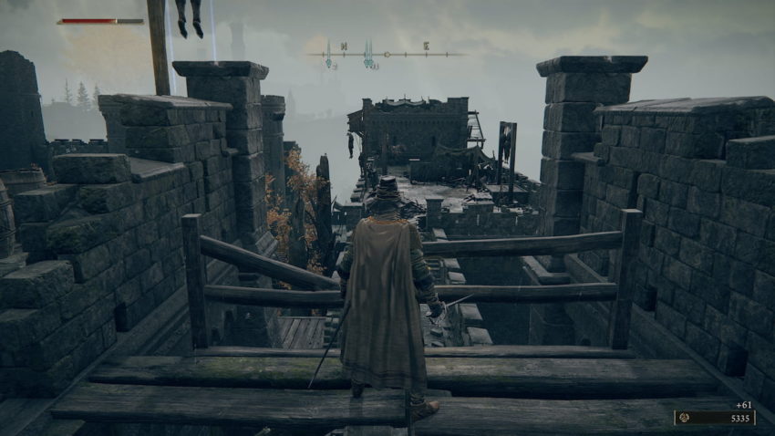 Make sure to go to the right of the fire. There, you’ll be able to enter the interCastleollow the path up to the top of the castle and go up two flights of ladders. On the second ladder, proceed forward until you can drop down to a rampart. There, you’ll find a handful of flying enemies you’ll need to dispatch, and once they’re gone, go to the left to a lower rampart where creatures are fighting one another.