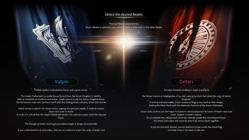 The Vulpin and Ontari started as one power known as the Solum Empire. As technology grew and power with it, the empire started to view things differently. The empire was fractured and the Vulpin and Ontari were formed. Not much differentiates them from a gameplay perspective. Each realm contains the same exact playable races and character classes to use. The difference is purely lore and cosmetic based.