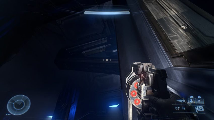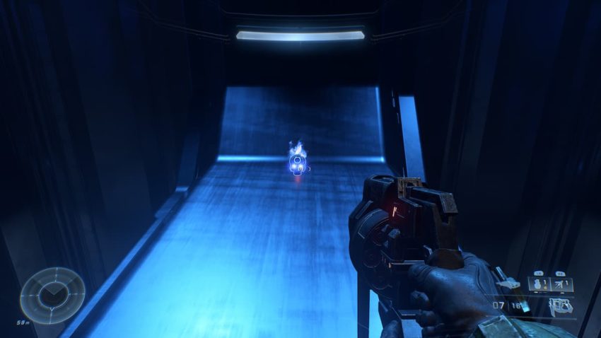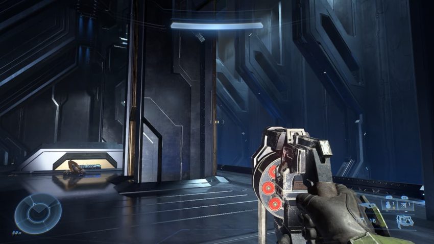 The second level is still linear, meaning there shouldn’t be many issues navigating this space. At some point during the level, you’ll walk through a gigantic room with lit-up slabs swirling around. After making your way through the slabs, you’ll be reunited with Cortana’s replacement. After transferring the AI into Chief’s suit, the platform begins moving.