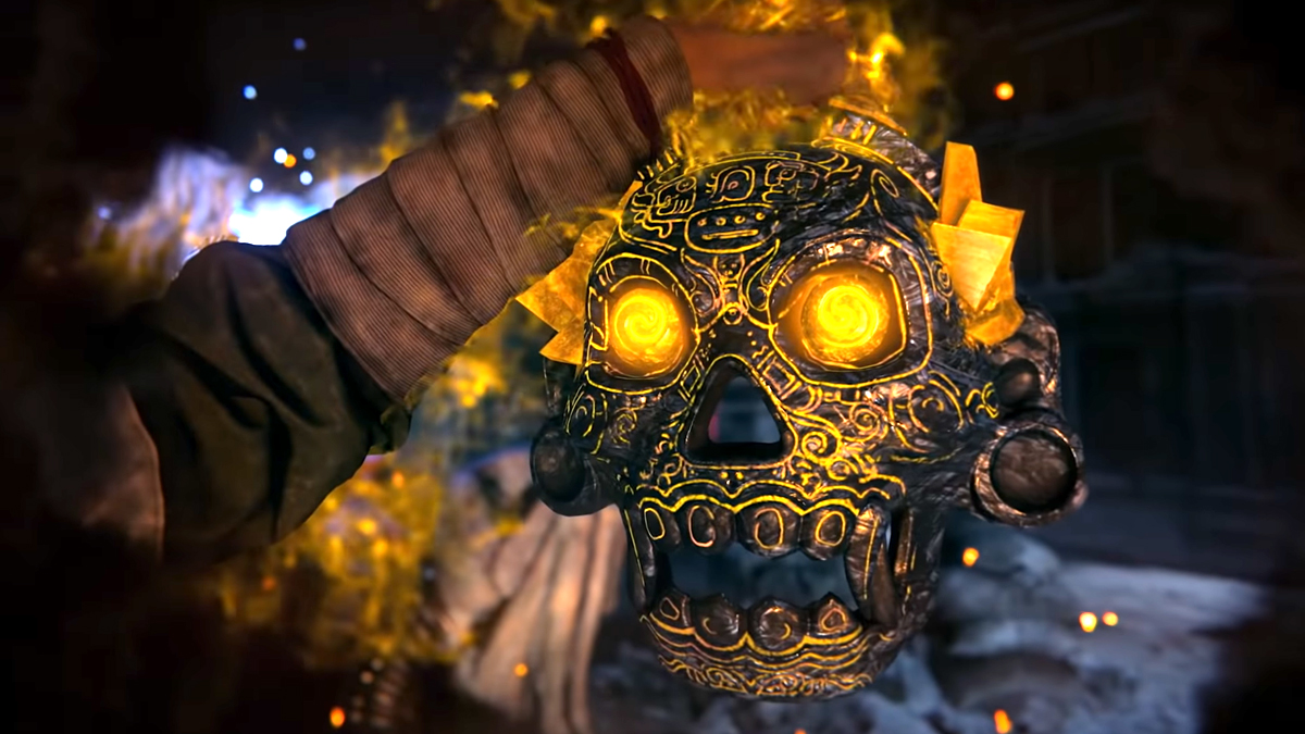 The standout part of the trailer is a collection of weapons that harness occult magic. We see a yellow skull and a purple knife that talk back to players just like the spirit that contacted von List. The knife creates a protective circle of purple flames around the party, so any approaching zombie will take damage from the fire if they get too close. We also catch glimpses of some sort of floating red totem power, a burst of cold winter wind, and an explosive blue orb. These colorful, glowing weapons and their abilities will be the key to surviving in Vanguard’s Zombies mode.