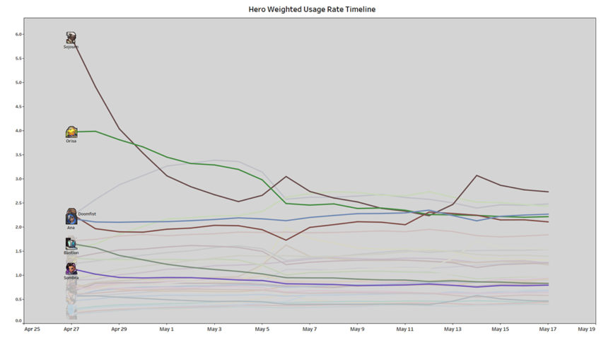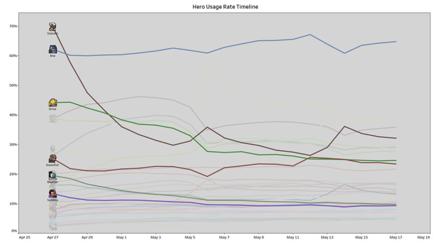 Blizzard shared its beta analysis charts in a blog post, and there’s a lot to learn from the different ways it presented the data. The first (pictured below) is an unweighted hero usage chart that looks at how often a certain character was used. While Sojourn started out quite high, her usage decreased over time. Ana, on the other hand, dominates the chart. This is true of Overwatch as well, as she’s a common pick in the first game.